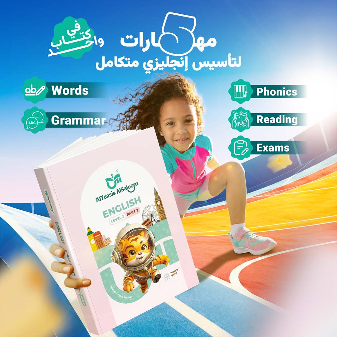 A complete English foundation book for KG2 الأطفال، designed to build strong reading and writing skills through an interactive, step-by-step learning system covering 5 essential language skills.